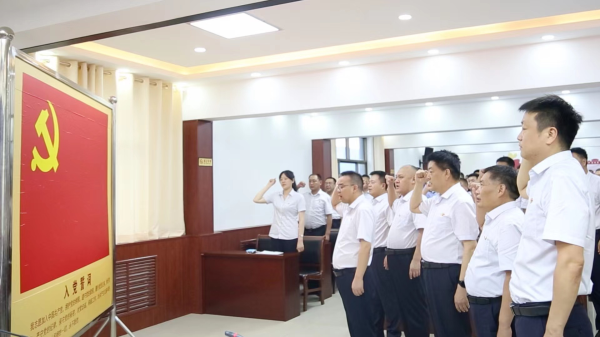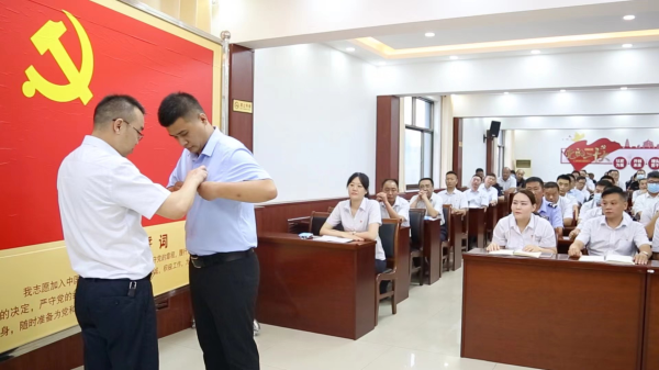 接著,在王高峰同志帶領(lǐng)下,面向鮮紅的中國共產(chǎn)黨黨旗,新、老黨員舉起右拳、莊嚴(yán)宣誓,鏗鏘有力的誓言響徹會(huì)場,短短80個(gè)字的入黨誓詞,震撼著現(xiàn)場每一位黨員。