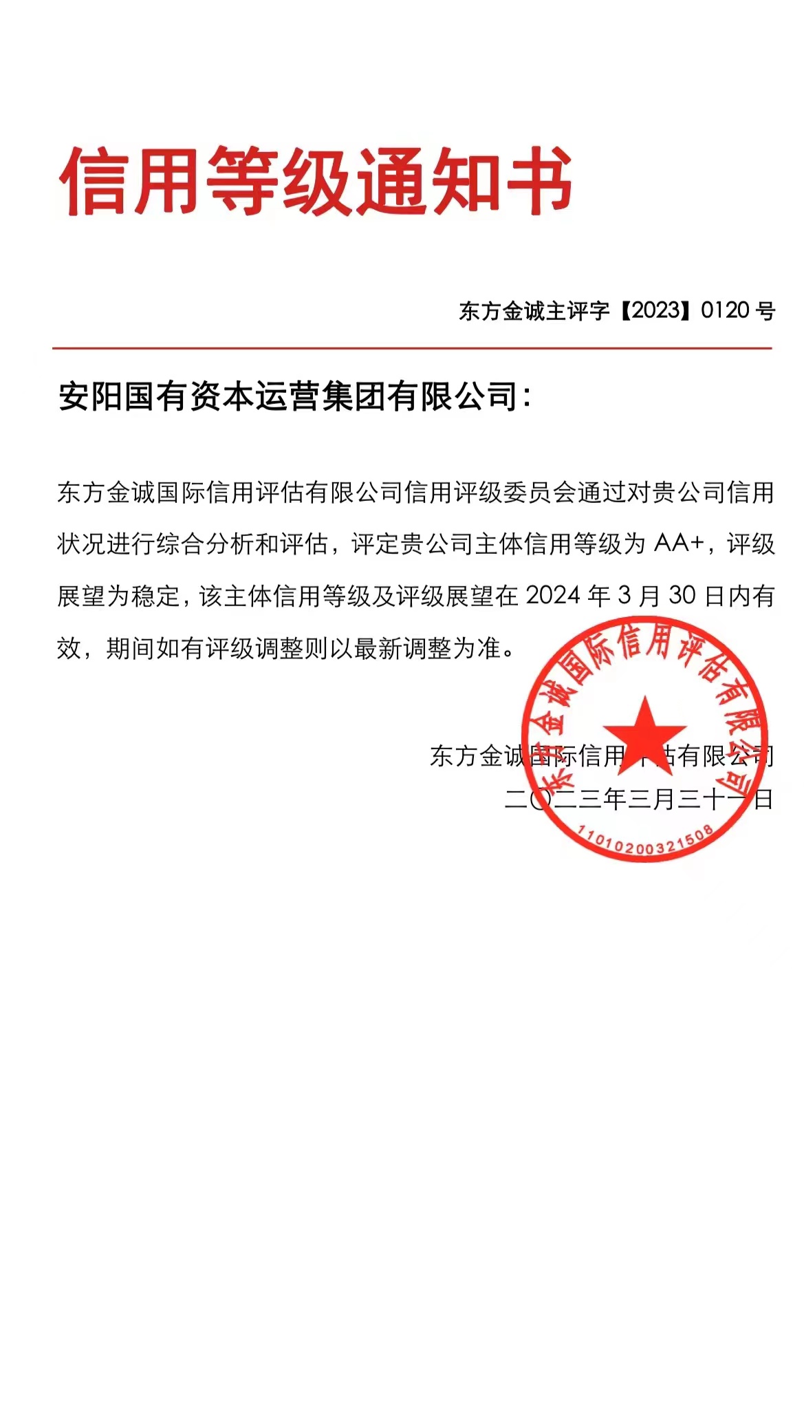 2023年4月7日,經(jīng)國內(nèi)權(quán)威信用評級機(jī)構(gòu)——東方金誠國際信用評估有限公司出具正式報(bào)告,評定安陽國有資本運(yùn)營集團(tuán)有限公司(下稱安陽國資集團(tuán))主體信用等級為“AA+”,評級展望為“穩(wěn)定”,安陽國資集團(tuán)成為我市首家主體信用為“AA+”的企業(yè),實(shí)現(xiàn)了我市國有企業(yè)增信提級的重大突破。