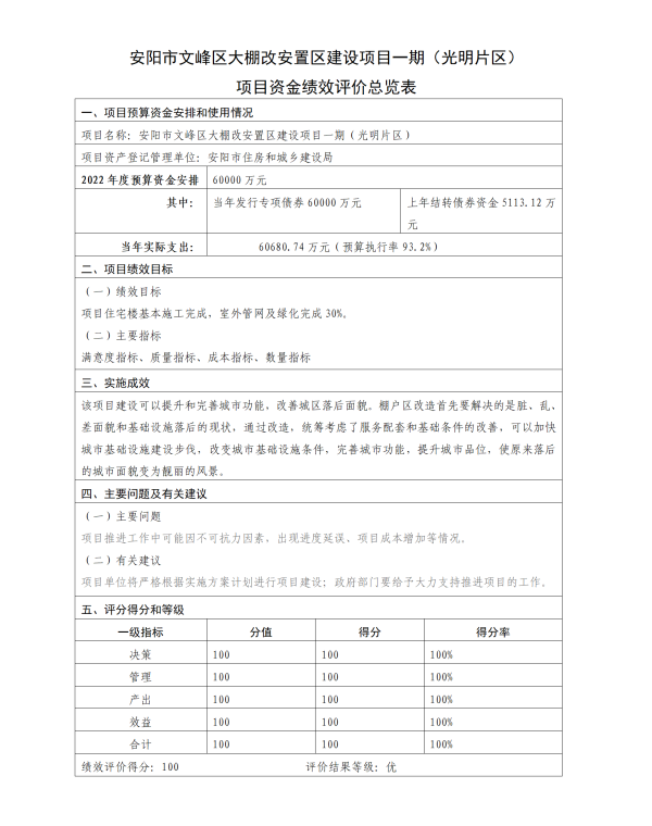安陽市文峰區(qū)大棚改安置區(qū)建設(shè)項(xiàng)目一期(光明片區(qū))項(xiàng)目資金績(jī)效評(píng)價(jià)報(bào)告